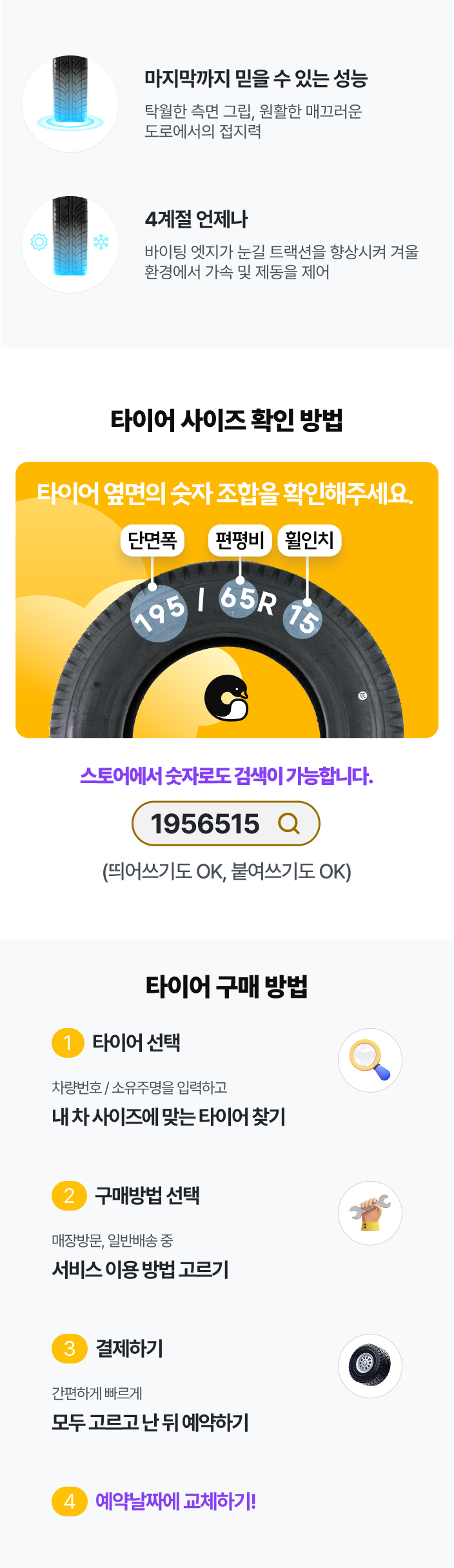 - 기존에 장착된 타이어가 런플랫일 경우, 매장별로 책정된 공임에 따라 추가 비용이 발생할 수 있습니다.