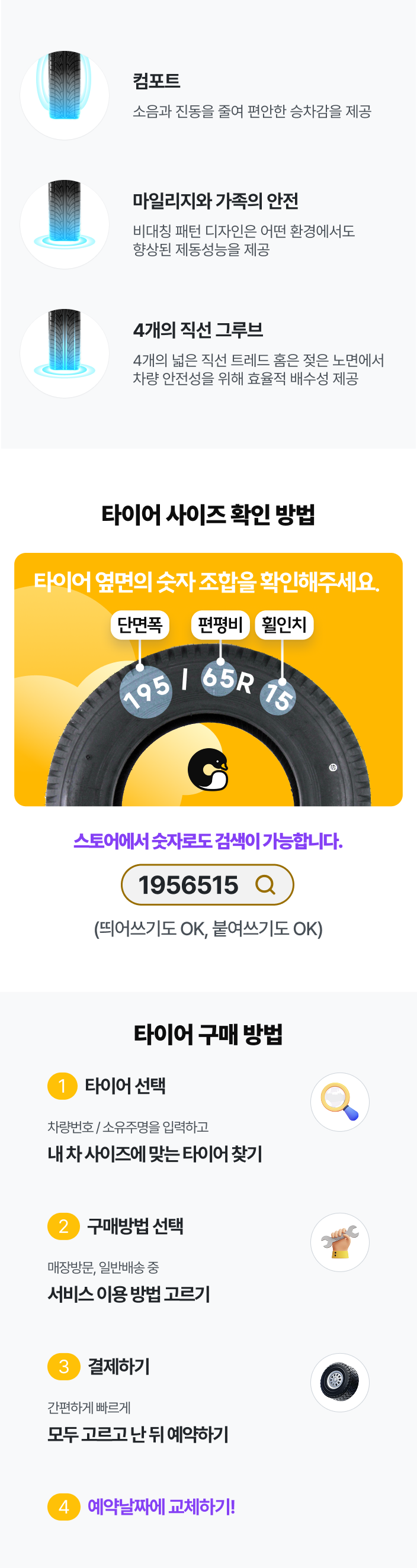- 기존에 장착된 타이어가 런플랫일 경우, 매장별로 책정된 공임에 따라 추가 비용이 발생할 수 있습니다.