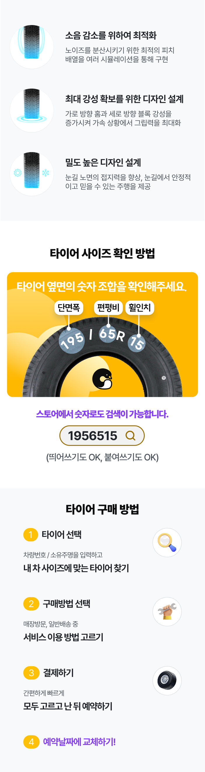 - 기존에 장착된 타이어가 런플랫일 경우, 매장별로 책정된 공임에 따라 추가 비용이 발생할 수 있습니다.