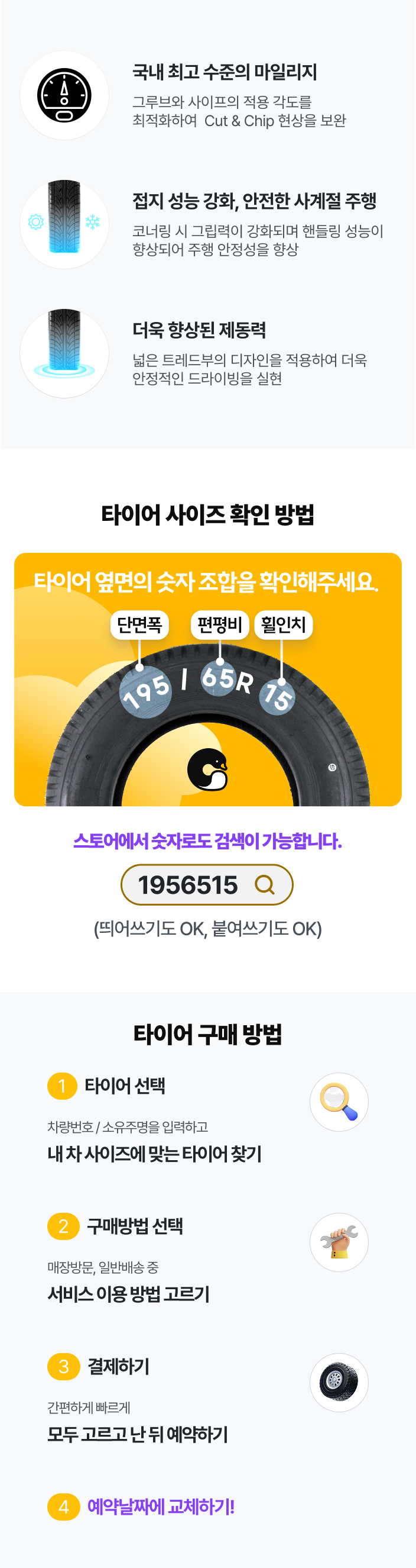 - 기존에 장착된 타이어가 런플랫일 경우, 매장별로 책정된 공임에 따라 추가 비용이 발생할 수 있습니다.
