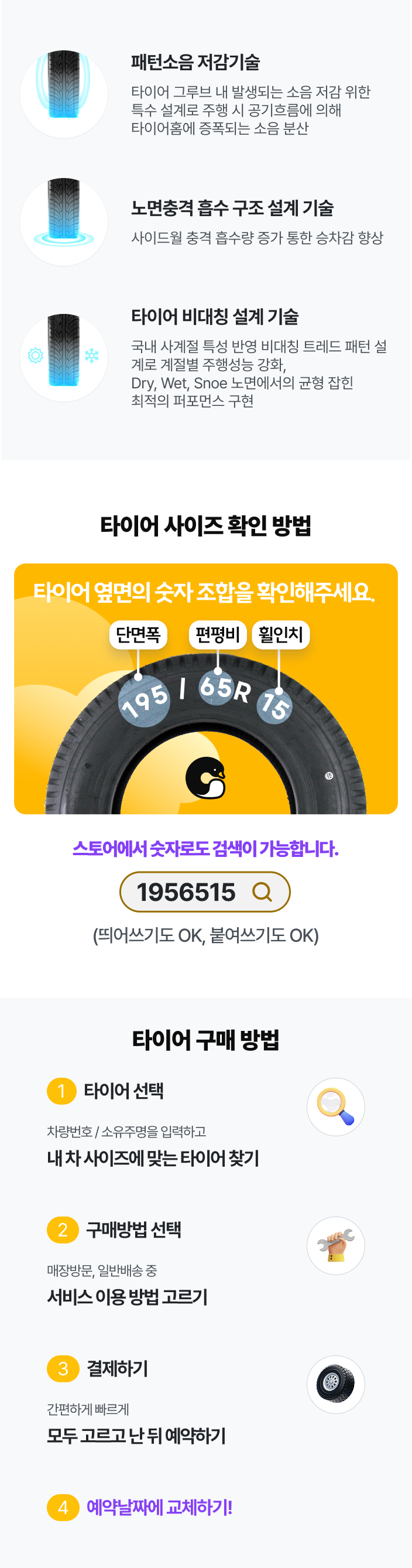 - 기존에 장착된 타이어가 런플랫일 경우, 매장별로 책정된 공임에 따라 추가 비용이 발생할 수 있습니다.