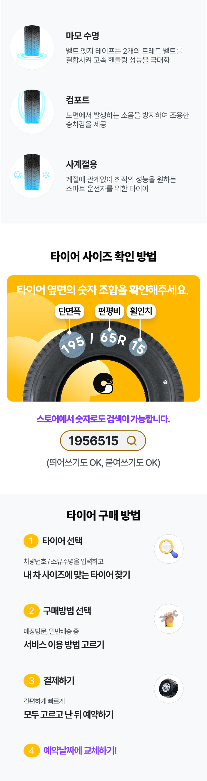 - 기존에 장착된 타이어가 런플랫일 경우, 매장별로 책정된 공임에 따라 추가 비용이 발생할 수 있습니다.