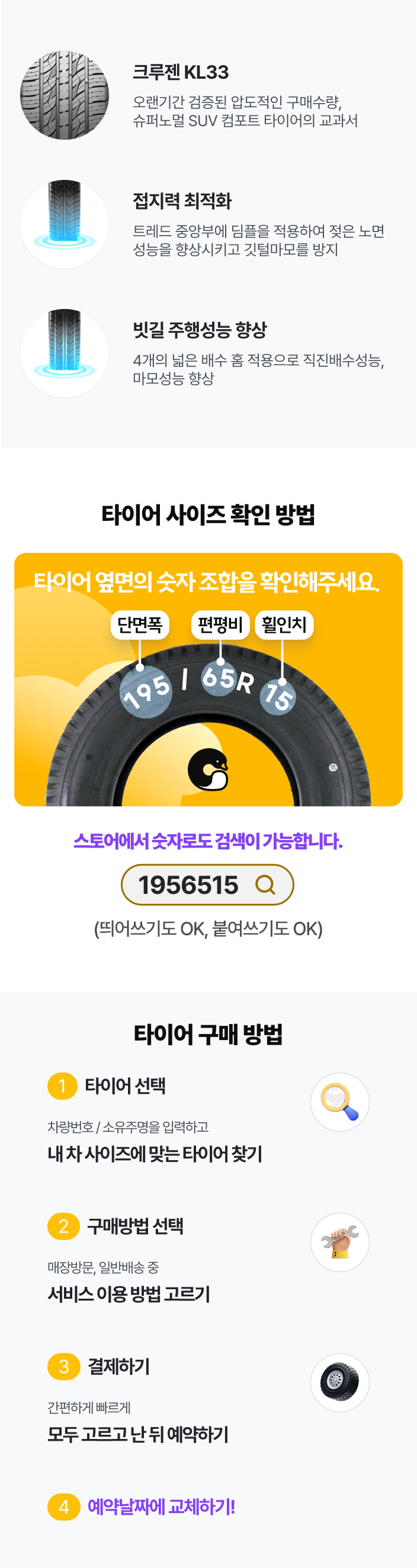 - 차량 상태(특수 차종 혹은 사제 휠)에 따라 장착이 불가하거나 추가 비용이 발생할 수 있으니, 장착 가능 여부는 해당 매장에 문의 또는 고객센터로 확인해주시기 바랍니다.