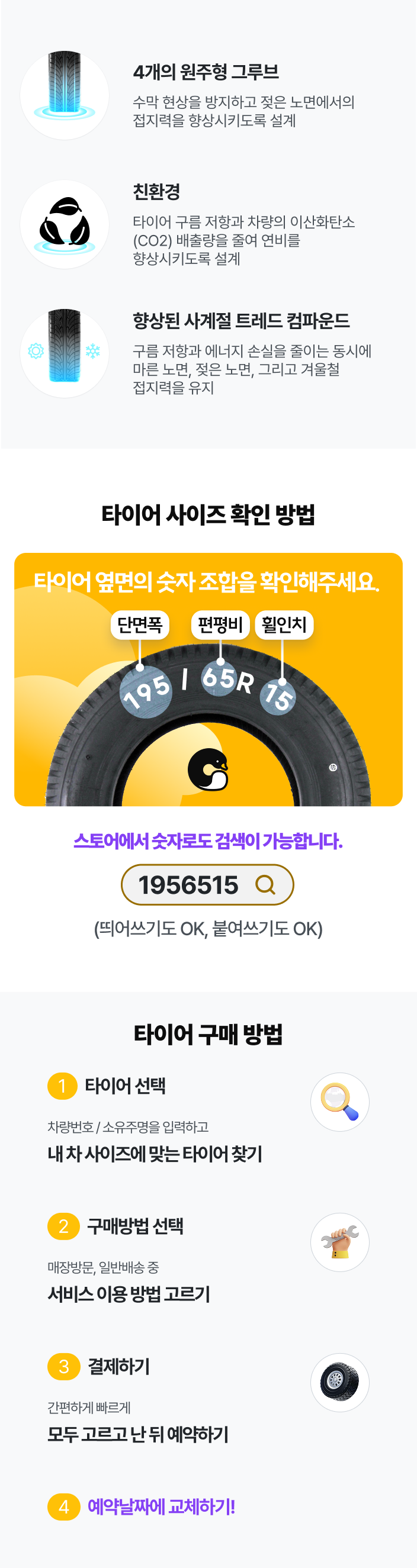- 기존에 장착된 타이어가 런플랫일 경우, 매장별로 책정된 공임에 따라 추가 비용이 발생할 수 있습니다.