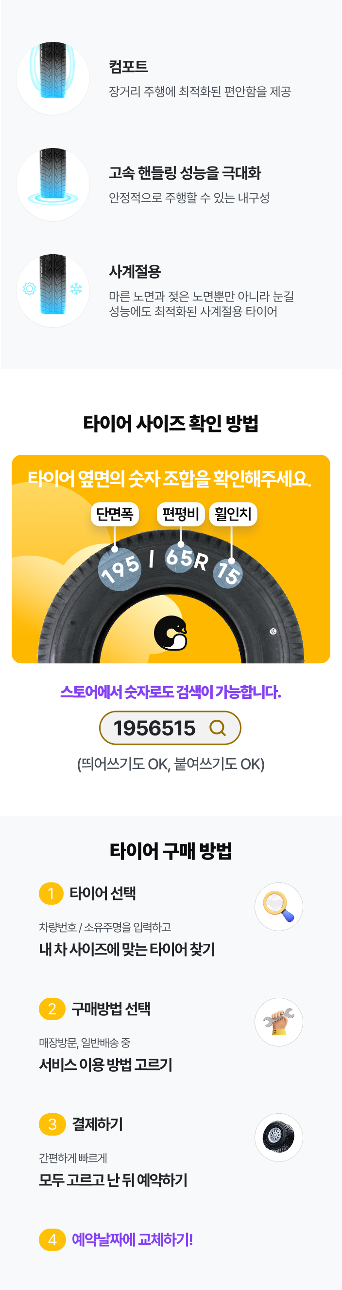 - 기존에 장착된 타이어가 런플랫일 경우, 매장별로 책정된 공임에 따라 추가 비용이 발생할 수 있습니다.